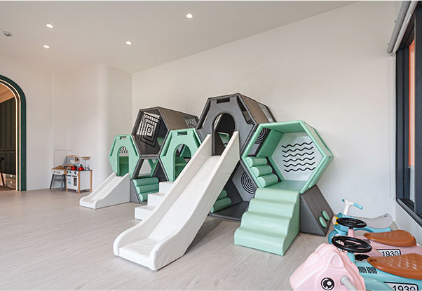 遊戲室專為小朋友設計,提供溜滑梯、玩具車及各式玩具,讓孩子們可以自在遊玩,開心度過每一刻。